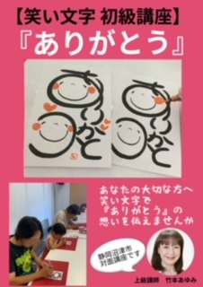 「ありがとう」について考えながら、笑い文字の「ありがとう」が90分で書けるようになります。初めて書く方におすすめです。