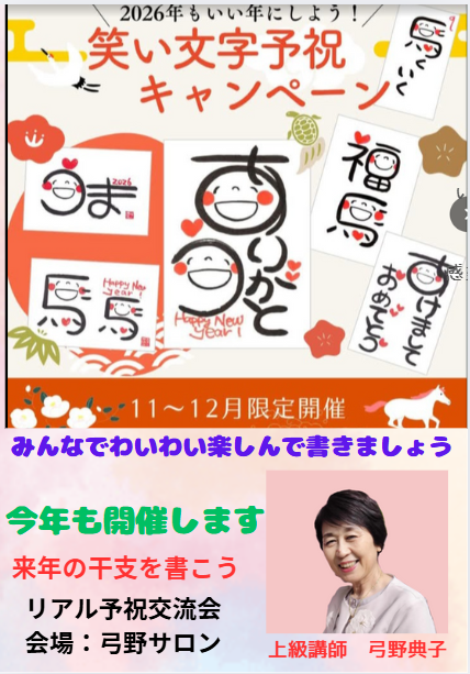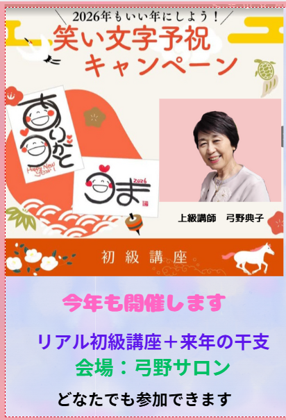 私と直ちゃんとの出会いは、2021・11・20私が市民会館のロビーで花束を持って座っていたら、「弓野先生ですよね?」「私弓野先生の笑い文字講座が受けたいんですがいつあいてますか?」と、飛びっきりのキラキラとした笑顔で声を掛けられました。早速次の月初めには初級講座を受講。そして「前からポスターを見ていて笑いヨガもやってみたかったんです。」それからの彼女は、私の笑いヨガクラブ「のりのり日立笑いクラブ」に毎回参加するようになりました。笑い文字講座も上級講座まで受講してくれる、とっても熱心な受講生さんのお一人となりました。それにイベントで笑いヨガ・笑い文字の講座があると必ず参加してお手伝いしてくれる、私の熱烈なファンのお一人となってくれました。現在は、年賀状交流会でのご自分の夢を叶えるため、ピアノをまた弾き始めたこと、そしてお仕事も始めたので、なかなか直ちゃんに会えないのが残念ですが、3カ月ごとの「のしワークショップ交流会」には必ず参加してくれて変わらず笑顔を見せてくれています。そんな直ちゃんだから、お仕事先の職員さんや患者さんにも、きっと安心を与えるキラッキラな最高の笑顔で接しているのかと思うとずっとずっと応援したくなる受講生さんです。