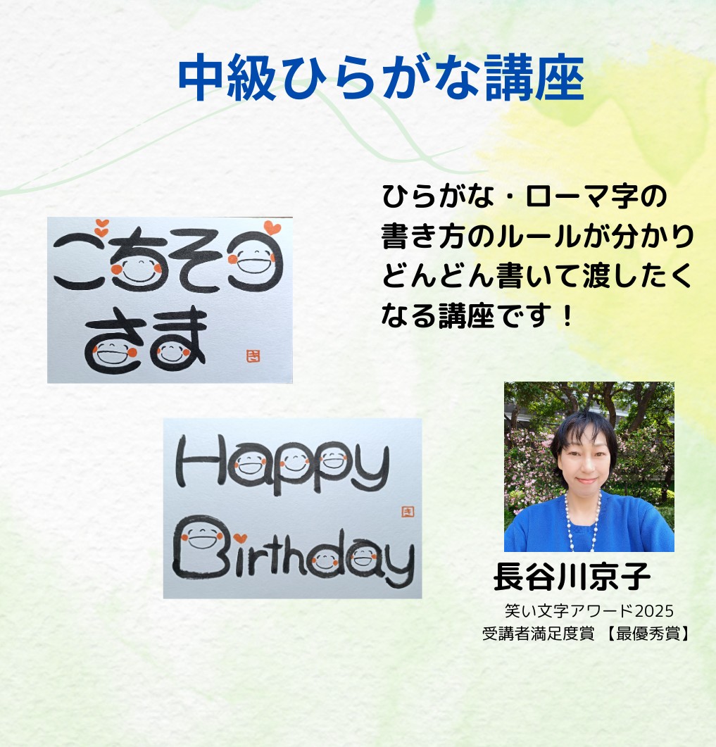 【残席あり】 【オンライン】笑い文字でひらがな・ローマ字の書き方のコツをつかもう!中級かな講座 1月14日(水)14:00~16:00 締め切り1月5日 | 笹部 亜矢子
