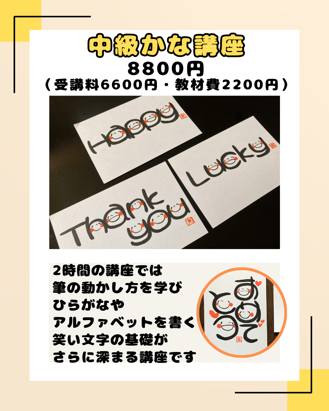 笑い文字のもう一つの形式が習えます。より笑顔を大きく描き、心に深く届くメッセージを書く方法をお伝えします。