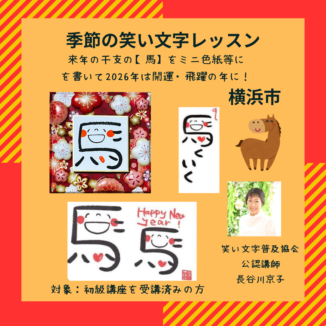 【残席あり】 季節の笑い文字レッスン【横浜市】【冬CP】 馬車道で『馬』を書いて2026年も開運! 11/15 (土) | 長谷川 京子